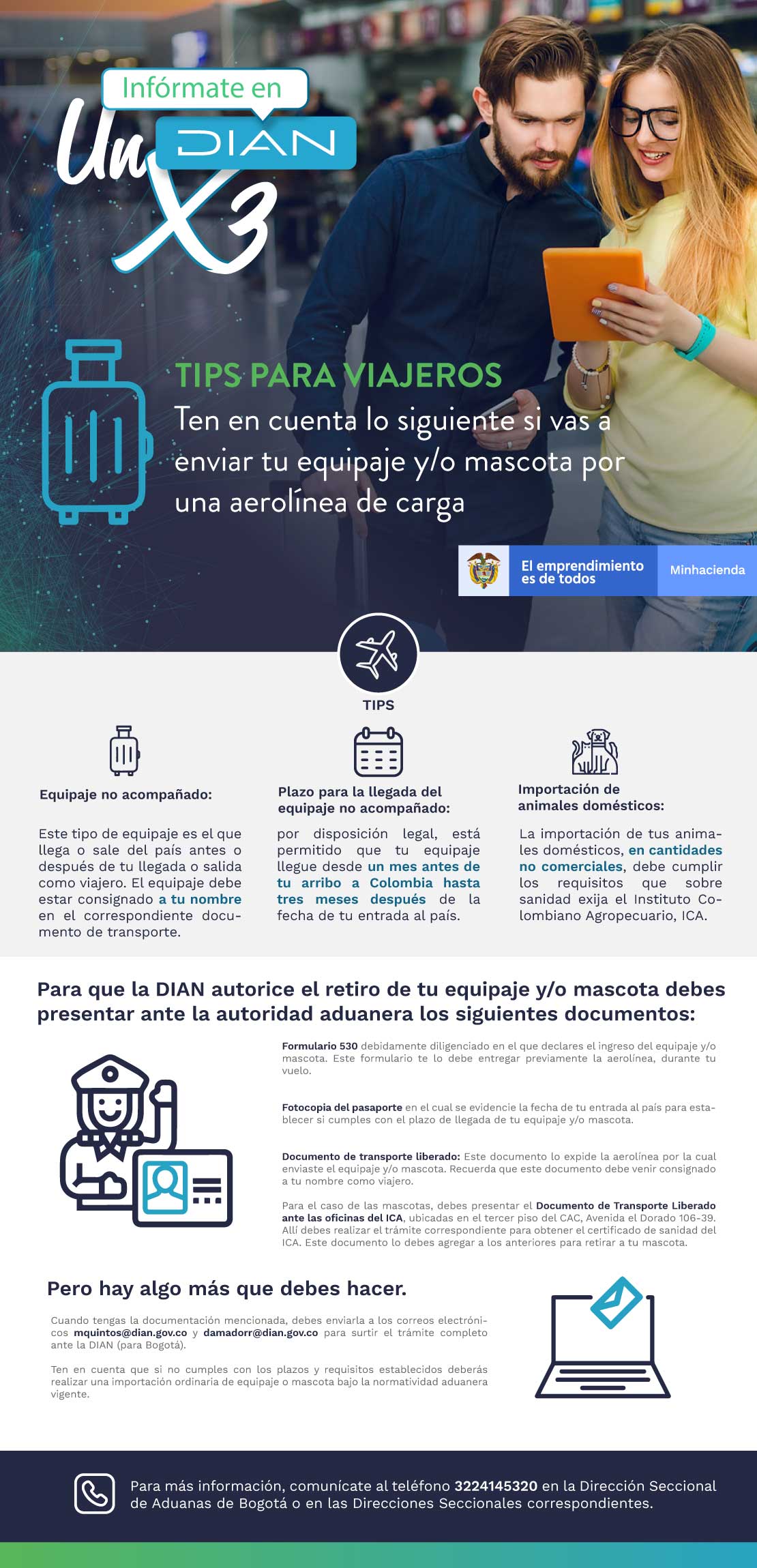 Condiciones Colombia ingreso mercancía como equipaje no acompañado1. Tiempo de permanencia en el exterior: mínimo 5 días 2. Valor máximo de la mercancía en US dólar: 3.000$ 3. Tipo de bienes considerados equipaje no acompañado: artículos de uso doméstico sean o no eléctricos, artículos deportivos y artículos propios del arte u oficio del viajero 4. cantidad máxima unidades x artículo - Artículos de uso doméstico, deportivo y/o propios de su arte, profesión u oficio: 3 unidades cantidad máxima unidades x artículo - AArtículos para el uso personal o familia: 10 unidades 5. Impuesto a pagar (según el valor de la mercancía): 15% Ejemplo para el cálculo del impuesto |